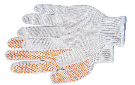 *Natural string knit PVC dots on one side *Color coded cuff *Ribbed knit wrist. Weight: 600-800g Size: 6-10"
